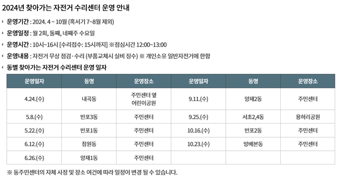 2024년 서초구 찾아가는 자전거 수리센터 운영 안내 정보 안내드립니다.
