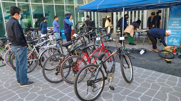 서울시 서초구에 사는 구민들을 위해 직접 주민센터와 공원으로 찾아가 자전거를 점검, 수리해주는 '찾아가는 자전거 수리센터'를 운영합니다.