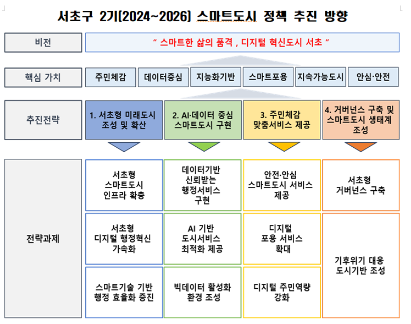 서초구의 스마트 도시 비전은 첨단 기술을 활용하여 주민의 삶의 질을 높이고, 안전하고 지속 가능한 도시 환경을 조성하는 데 초점을 맞추고 있습니다. 서초구는 이미 2022년 국토교통부 주관 '스마트도시 인증 공모'에서 전국 최고 수준의 스마트 도시로 인정받은 바 있으며, 이를 바탕으로 다양한 스마트 기술과 행정 서비스를 접목해 '생활 밀착형 스마트 행정'을 구현하고 있습니다. 아래는 서초구 스마트 도시 비전의 주요 내용과 방향성을 정리한 것입니다.